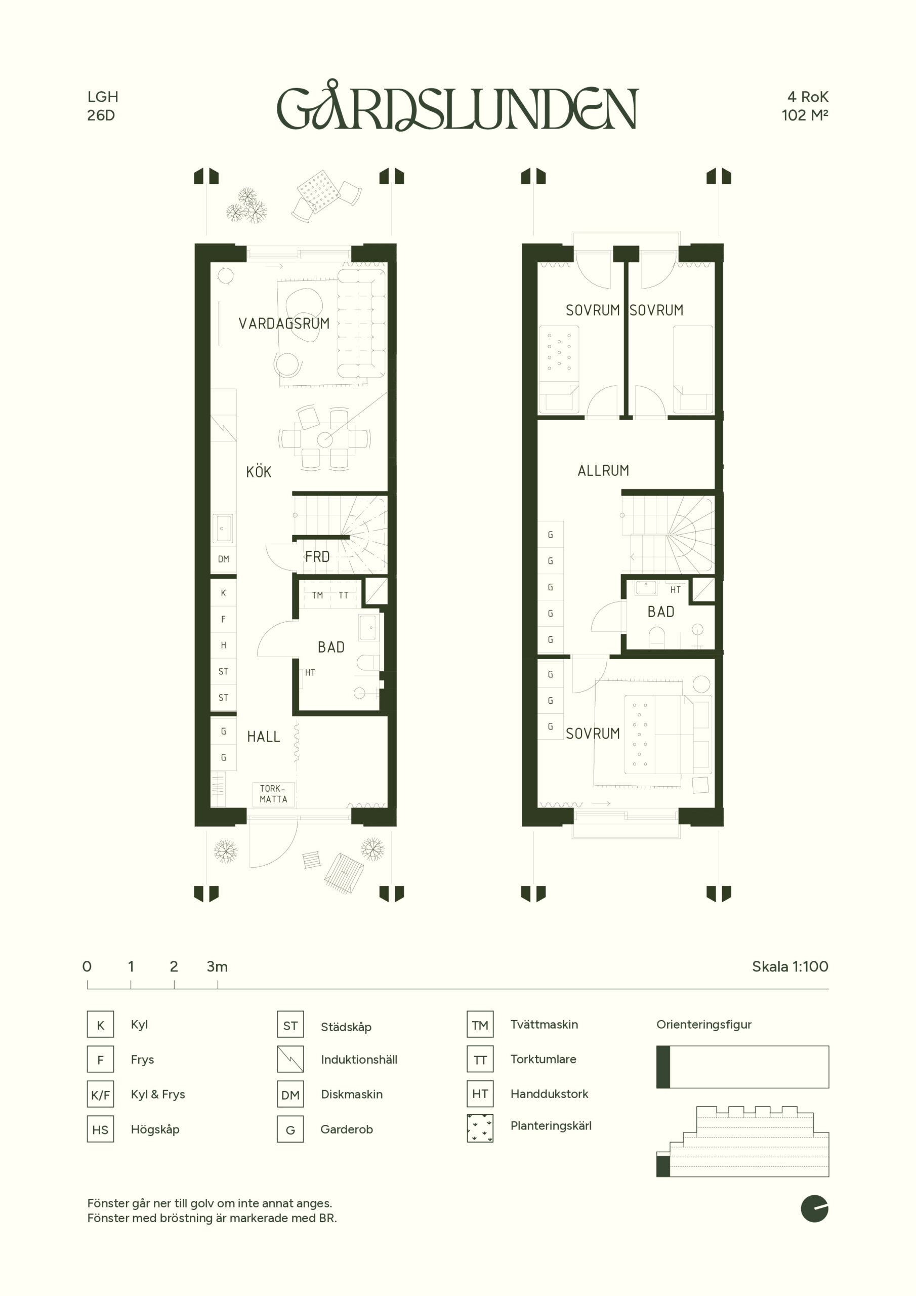 Stadsradhus i två plan med egen terrass som förlänger sällskapsytorna mot gården. Entréplanet samlar kök och vardagsrum i en naturlig helhet med plats för matbord och soffgrupp. Badrum med TM/TT intill hall/arbetsrum/sovrum. En trappa upp finns tre sovrum med avskildhet och goda förvaringsmöjligheter samt liten tv-hörna och badrum. Ett hem med tydlig rytm mellan socialt och privat, där utemiljön blir en självklar del av vardagen.